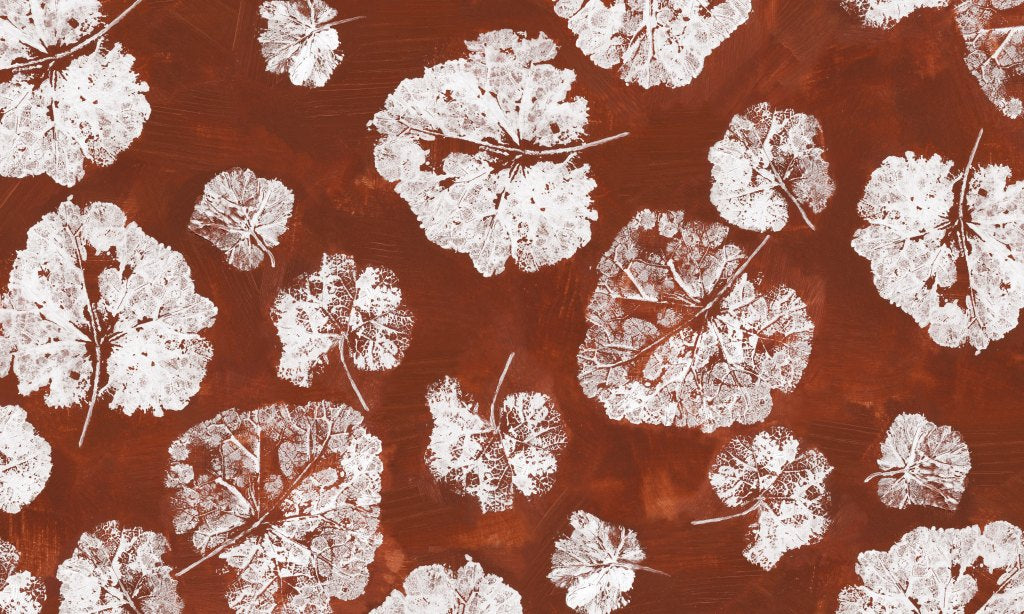 Foglia Rust to wzór namalowany/ odciśnięty ręcznie jako tatuaż roślinny. Obraz został przedstawiony w nowoczesnej formie tapety wielkoformatowej. Wzór przygotowany jest w barwach ziemi wpisujących się w aktualne trendy designu.