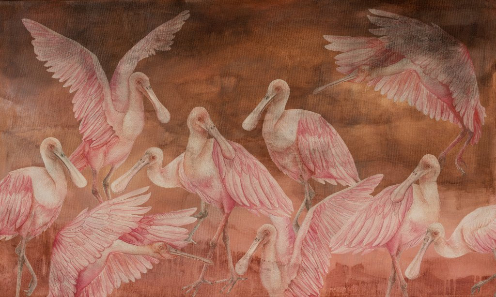 Tempesta Ajaja to połączenie intrygującego obrazu Tempesta z ręcznie malowanymi ptakami- warzęchami różowymi, których łacińska nazwa to Platalea ajaja. Każda warzęcha została narysowana ręcznie z wyjątkową dbałością o szczegóły. Zestawienie uroczych, różowych ptaków z nieco mrocznym tłem, daje wyjątkowo niebanalny efekt.