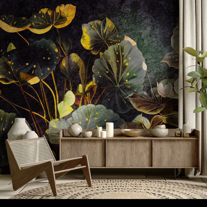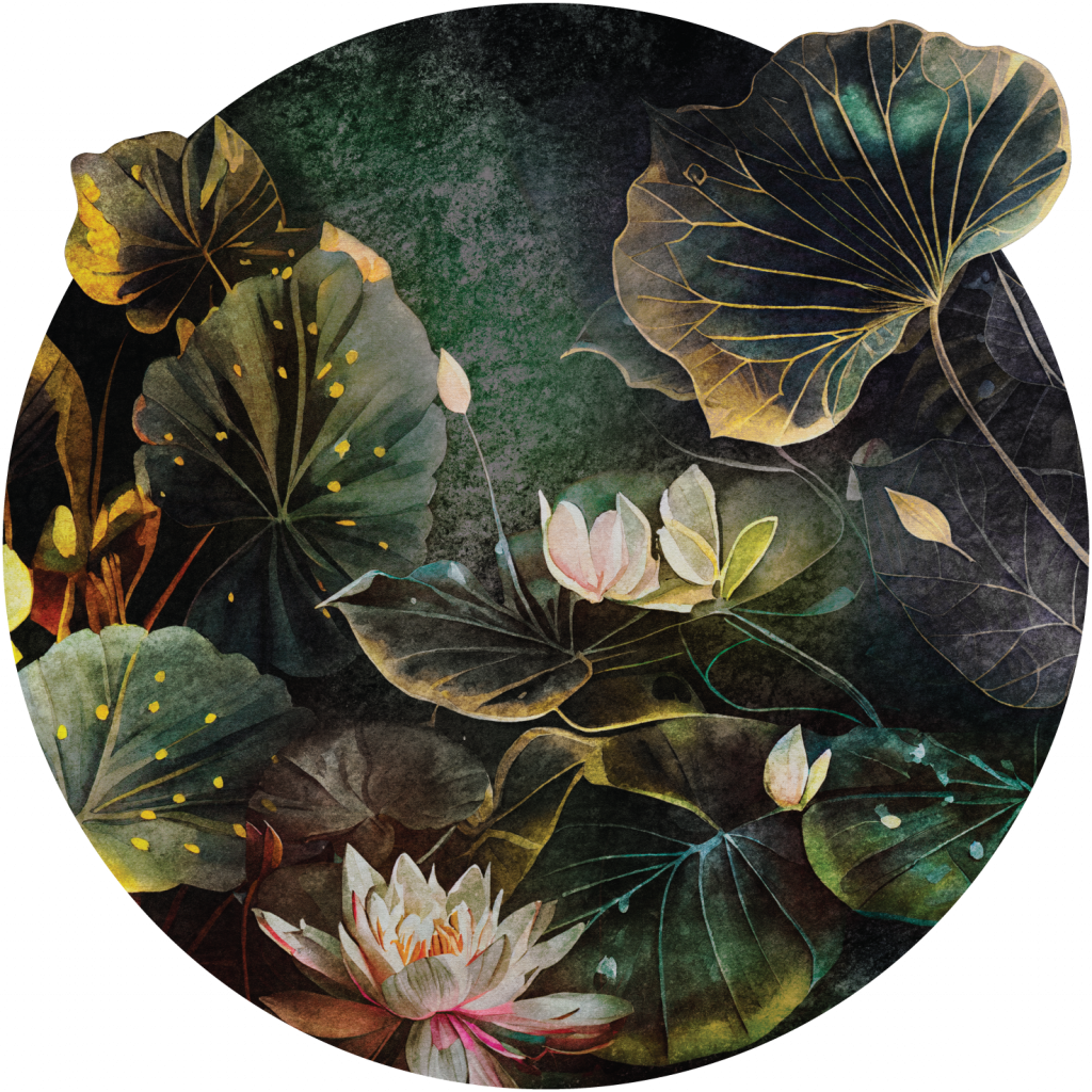 Clara to bajkowy wzór przedstawiający fantazyjny brzeg tajemniczego jeziora. Roślinność przedstawiona za pomocą głębokich, butelkowych zieleni skontrastowanych soczystą żółcią, sprawia wrażenie jakby oświetlało je ciepłe, magiczne światło. Tło ze strukturą kamienia dodatkowo podkreśla naturalny charakter wzoru.