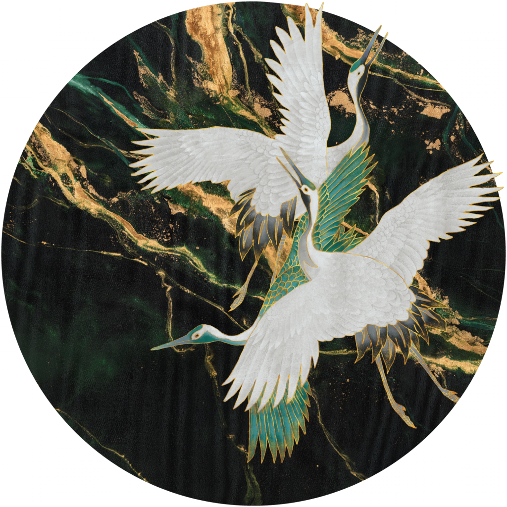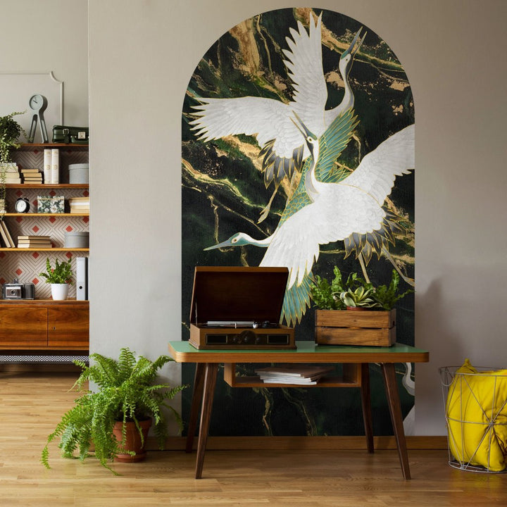 Tapeta Emerald Tsuru to delikatna dekoracja w kolorze butelkowej zieleni z dekorami w kolorze złota.. Idealne uzupełnienie aranżacji w małych wnętrzach, pasuje do stylu glamour, klasycznego czy nowoczesnego.