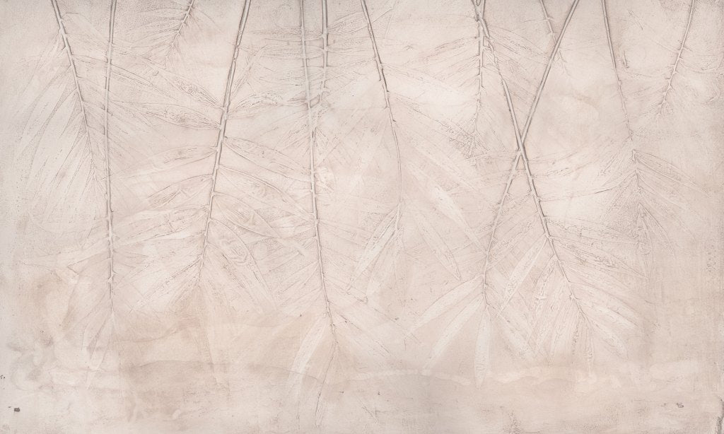 Tapeta „Fresco” to subtelna interpretacja naturalnych motywów inspirowanych liśćmi palmowymi, wykonana z artystyczną precyzją i dbałością o detale. Delikatne, jakby wytłoczone liście układają się w harmonijną, przestrzenną kompozycję, tworząc na ścianie efekt lekkości i głębi. Faktura przypomina klasyczne freski lub odciski roślin w tynku, co podkreśla unikatowy, rzemieślniczy charakter tej tapety.
