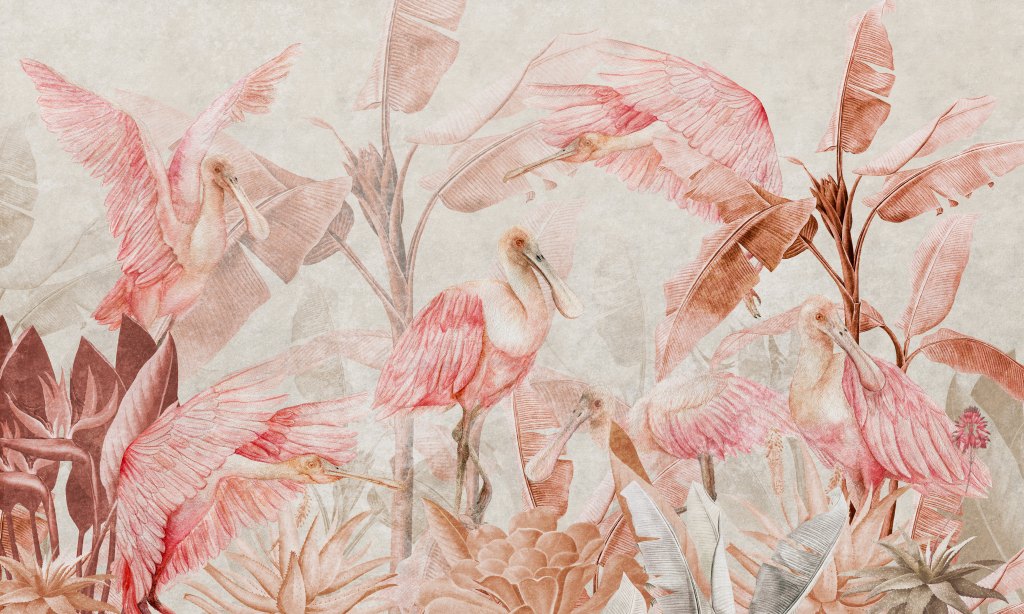 Rainforest Ajaja Rosso jest mariażem bestsellerowego wzoru Rainforest z nowym wzorem Ajaja. Warzęchy różowe, czyli Platalea ajaja, jak wskazuje ich polska nazwa, zachwycają wyjątkowym kolorem piór, które zestawione z rdzawą, tropikalną roślinnością, gwarantują spójność kolorystyczną. Rainforest Ajaja to propozycja bardzo energetyczna, która tchnie życie i dynamizm do każdego wnętrza.
