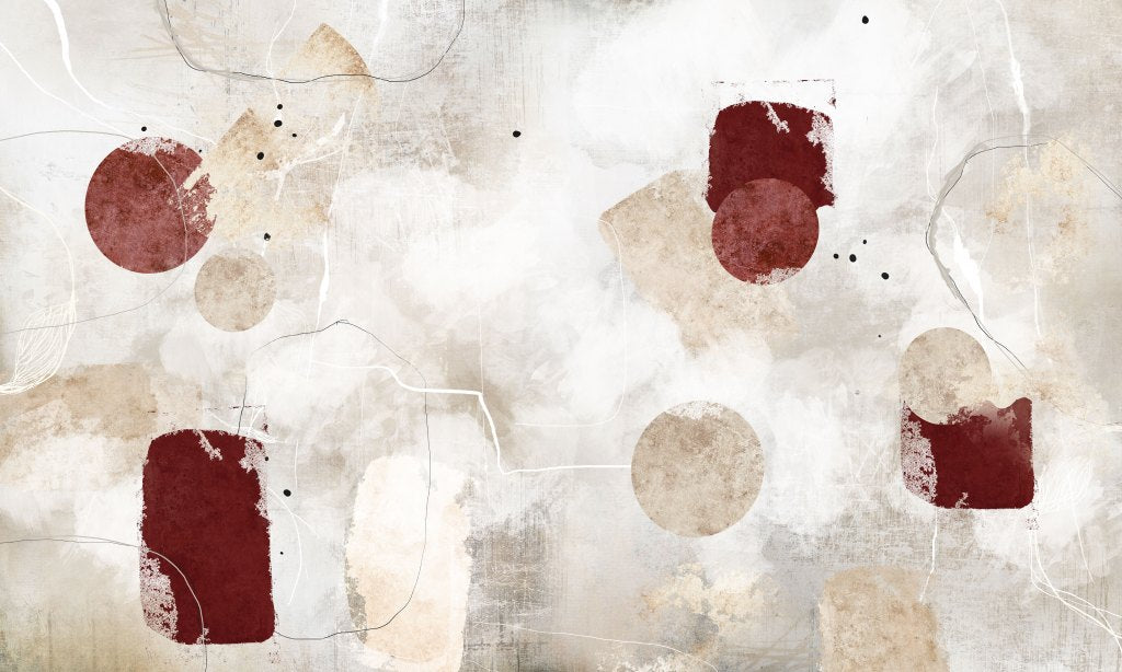 Tapeta „Rojo” to nowoczesna kompozycja abstrakcyjna, która łączy surową ekspresję sztuki współczesnej z subtelnością naturalnych faktur. Geometryczne formy – koła i prostokąty – zostały rozmieszczone swobodnie na nieregularnym, teksturalnym tle, przywodzącym na myśl warstwowo malowaną ścianę lub płótno artysty. Wyraziste akcenty w głębokiej czerwieni kontrastują z delikatnymi odcieniami beżu i bieli, tworząc efektowną, ale nienachalną dekorację ścienną.