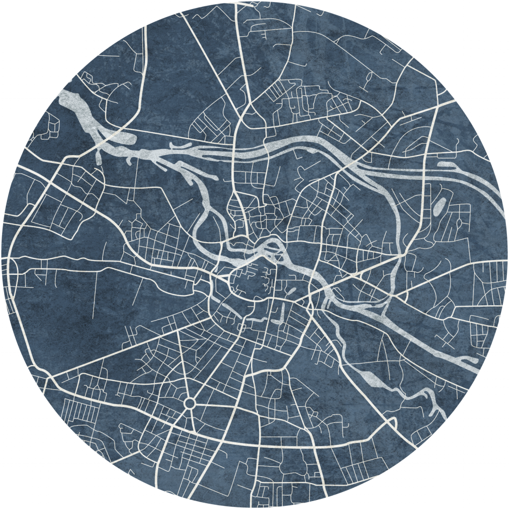 Breslau to grafika przedstawiająca plan miasta Wrocław, ukazując urbanistyczny układ miasta. Na pierwszym planie widoczna jest gęsta sieć ulic, alei i dróg, które tworzą skomplikowany wzór łączący różne części miasta. Najbardziej charakterystycznym punktem na planie jest Stare Miasto, zaznaczone wyraźnie w centrum. Breslau, dzięki zastosowaniu ograniczonej liczby kolorów jest bardzo nowoczesnym wzorem idealnym do biur, restauracji czy innych przestrzeni użyteczności publicznej.