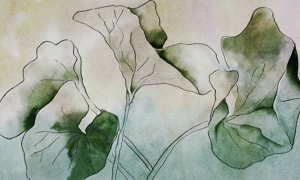 Hasu czyli lotos, jest uważany za roślinę doskonałą. Choć wyrasta na bagnach, jest nieskazitelnie czysty. To symbolem odrodzenia, kreacji, dobrobytu oraz fortuny. Nietuzinkowy wybór przedstawienia wyłącznie liści, a nie kwiatu lotosu sprawia, że wzór jest dużo bardziej stonowany i uniwersalny.