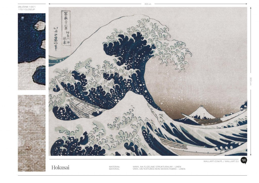 Hokusai to wzór inspirowany sztuką, w kolekcji Nature. Wielka Fala w Kanagawie - dostępna w formie muralu na ścianę. Tapeta w stylu Japońskim, będzie idealną ozdobą restauracji, hotelu, salonu czy sypialni.