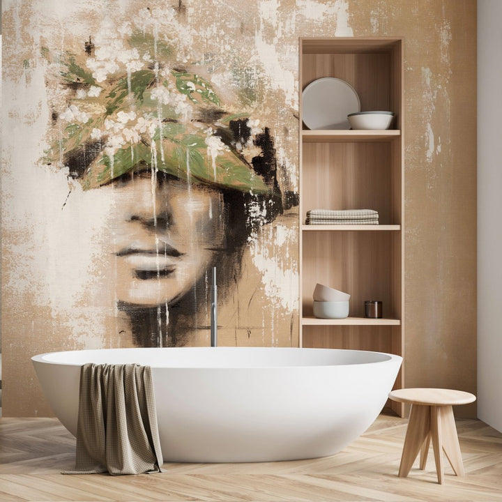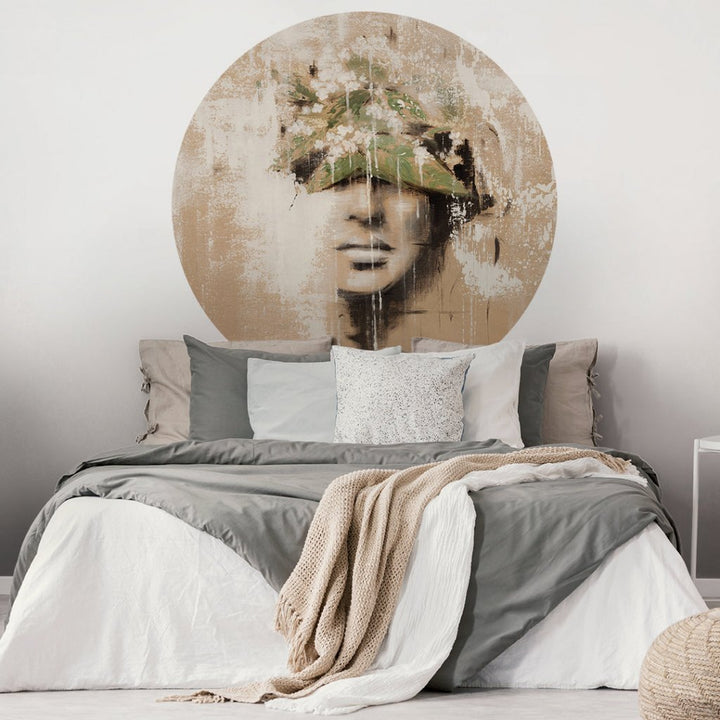 Castagna to tajemniczy wizerunek kobiecej twarzy kryjącej się za nieoczywistym motywem roślinnym. Delikatna zieleń liści i drobne białe kwiaty dodają romantyzmu i lekkości zagadkowym portretowi. Zastosowana nienachalna kolorystyka sprawi, że każde stonowane, minimalistyczne wnętrze stanie się kompletne.