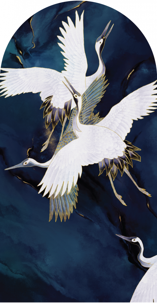 Tapeta Royal Tsuru to zestawienie koloru kremowego, królewskiego granatu i detali w barwach złota. Idealne uzupełnienie aranżacji w małych wnętrzach, pasuje do stylu boho, naturalnego, nowoczesnego i klasycznego.