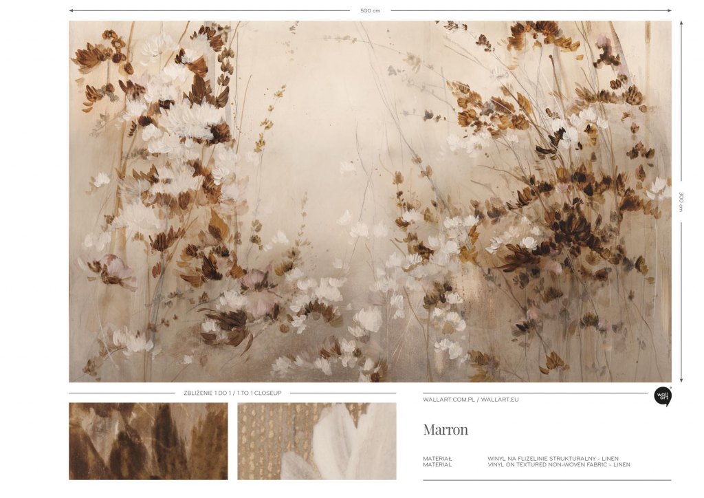Tapeta „Marron” to propozycja dla miłośników subtelnej elegancji i ciepłych, przytulnych tonów. Inspirowana naturalnym pięknem suszonych kwiatów i jesiennej roślinności, zachwyca malarską formą oraz miękkim, rozproszonym światłem, jakby uchwyconym tuż przed zachodem słońca. Kwiaty i liście – w bieli, karmelu, miedzi i odcieniach brązu – układają się w poetycką, nieco nostalgiczną kompozycję o spokojnym rytmie i lekkiej dynamice.