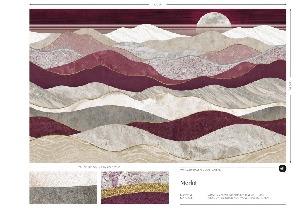 Merlot to abstrakcyjna kompozycję falistych linii i pasów w odcieniach burgundu, szarości, beżu oraz bieli, z delikatnymi złotymi akcentami, przywodząca na myśl krajobraz górski, z miękkimi liniami wzgórz i dolin. Każda z warstw ma unikalną teksturę, od szorstkich, kamiennych powierzchni po gładkie, marmurowe wykończenia, co sprawia, że Merlot ma jednocześnie harmonijny i dynamiczny charakter. Znakomicie sprawdzi się w nowoczesnym salonie, sypialni czy gabinecie. Ciepłe, ziemiste kolory i złote detale wprowadzą do wnętrza poczucie luksusu i wyrafinowania, idealnie komponując się z minimalistycznymi meblami i dodatkami w neutralnych barwach, takich jak biel, szarość i beż, podkreślając jednocześnie elegancję i styl pomieszczeniu.