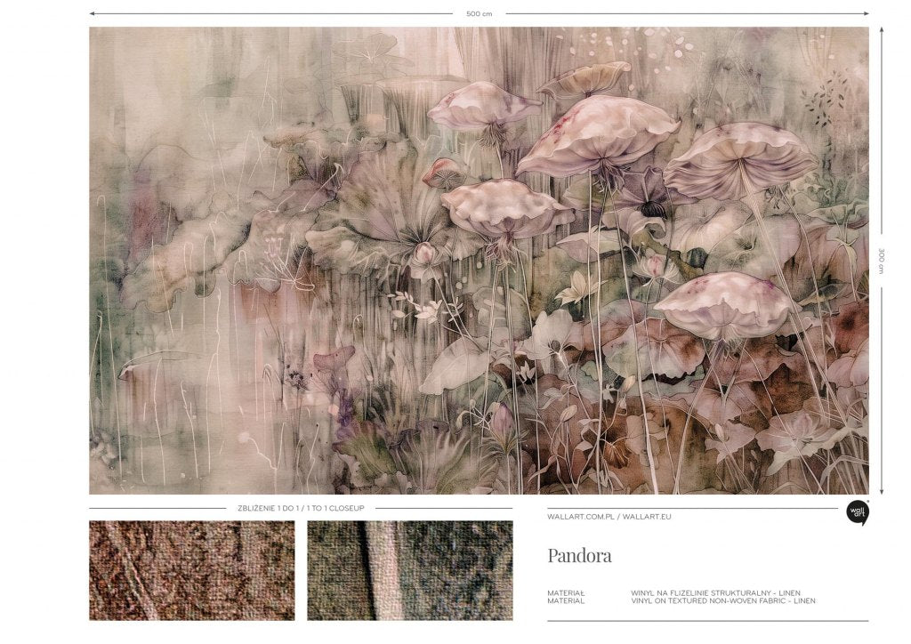„Pandora" przywołuje obraz porannego ogrodu skąpanego w miękkim świetle. Wzór przedstawia finezyjnie zilustrowane, niemal efemeryczne kwiaty – przypominające maki, lotosy i lilie wodne – otoczone miękko opadającymi liśćmi i wijącymi się łodygami. Wszystko to zostało uchwycone z niezwykłą precyzją i artystyczną wrażliwością, przypominając ręcznie malowaną ilustrację z botanicznego szkicownika. Kompozycja roślinna jest lekko przejrzysta – warstwowa, z subtelnymi prześwitami tła, które nadają wzorowi głębi i lekkości. Delikatne cieniowania i linearny kontur roślin wprowadzają dynamikę i wrażenie ruchu – jakby cała scena była zatrzymanym kadrem z rozświetlonego poranka w tajemniczym ogrodzie. Motyw jest harmonijny i spokojny, ale jednocześnie pełen życia – naturalny, lecz niebanalny. Wzór zachwyca dbałością o detale, balansując między akwarelową miękkością a graficzną precyzją.