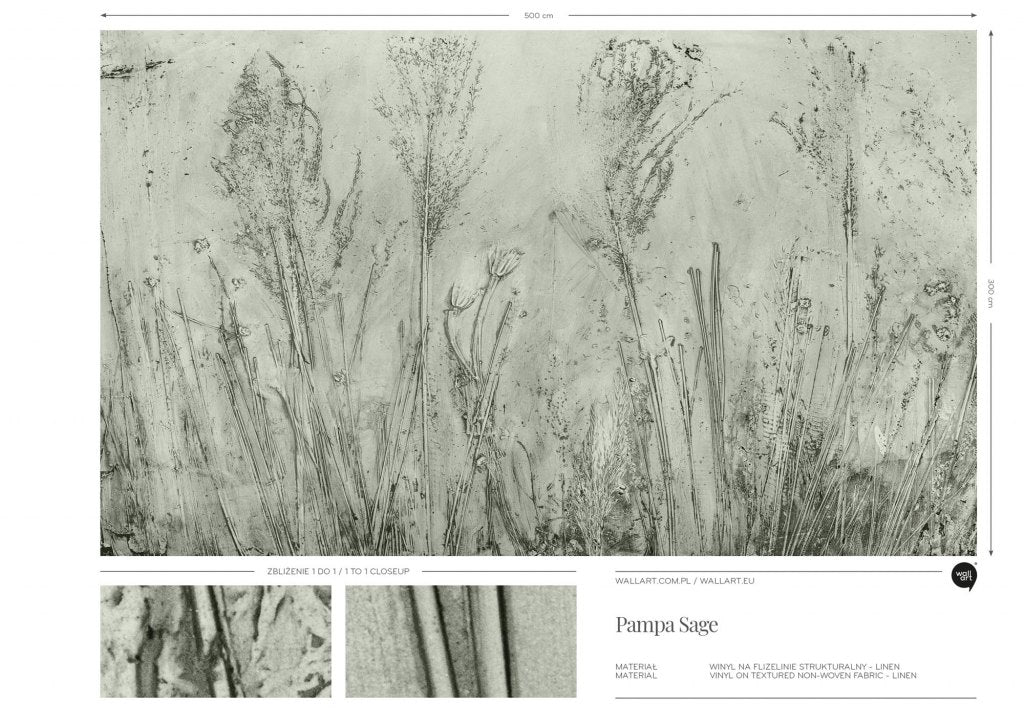 „Pampa Sage” to wariacja wzoru inspirowanego fakturą roślin odciśniętych w tynku – tym razem w zmysłowej, szałwiowej odsłonie. Subtelne łodygi i kwiaty wyłaniają się z matowego tła niczym ślad natury zatrzymany w czasie, tworząc kompozycję o lekkim, przestrzennym charakterze. Organiczne linie i faktury sprawiają, że całość przypomina relief – spokojny, ale niebanalny. To tapeta, która koi zmysły i równoważy wnętrze.