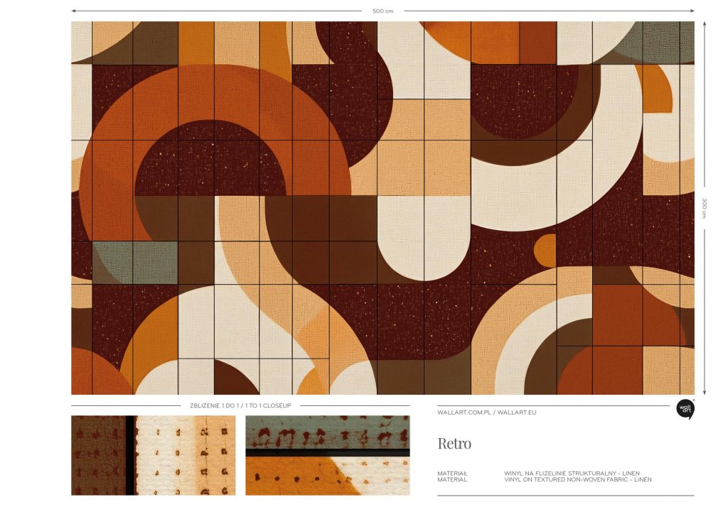 Paleta tapety „Retro” to intensywna mieszanka odcieni: karmelowy brąz, głęboka czerwień, ceglasta pomarańcza i ciepły beż, zrównoważone neutralnym kremem i chłodną oliwkową zielenią. Kolory zostały zestawione kontrastowo, ale z wyczuciem – tworząc przyjemny rytm wizualny i nadając wnętrzu ciepły, nostalgiczny charakter.