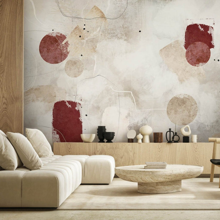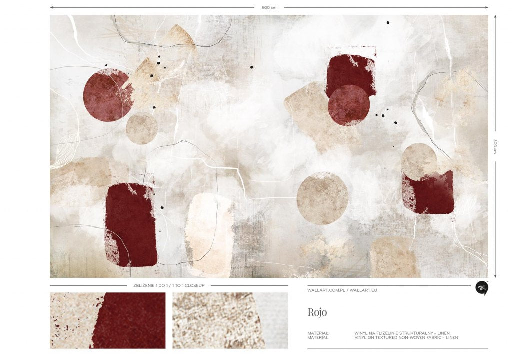 Tapeta „Rojo” to nowoczesna kompozycja abstrakcyjna, która łączy surową ekspresję sztuki współczesnej z subtelnością naturalnych faktur. Geometryczne formy – koła i prostokąty – zostały rozmieszczone swobodnie na nieregularnym, teksturalnym tle, przywodzącym na myśl warstwowo malowaną ścianę lub płótno artysty. Wyraziste akcenty w głębokiej czerwieni kontrastują z delikatnymi odcieniami beżu i bieli, tworząc efektowną, ale nienachalną dekorację ścienną.
