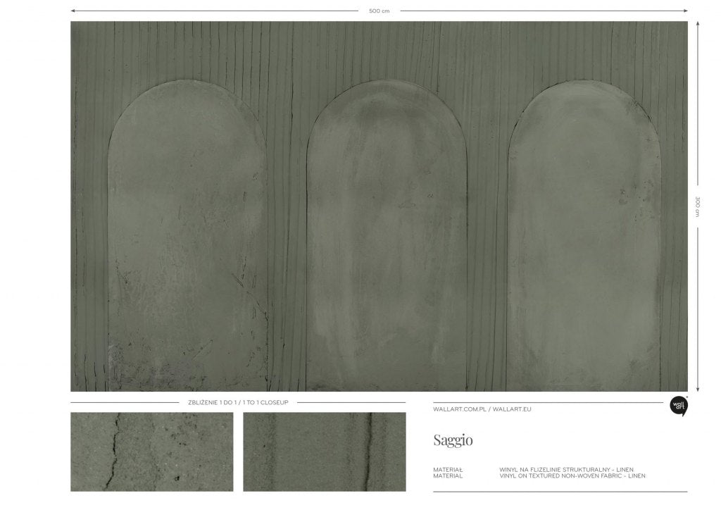 Saggio to wzór utrzymany w uspokajających, stonowanych odcieniach szarości i zieleni, z dominującymi motywami trzech pionowych łuków. Geometryczne formy, subtelnie zarysowane na tle o teksturowanej powierzchni, przypominające arkady, dodadzą wnętrzu głębi i harmonii. Dzięki swojej neutralnej kolorystyce i minimalistycznemu designowi, Saggio ten doskonale nadaje się do wnętrz urządzonych w stylu nowoczesnym, industrialnym lub minimalistycznym. Może stanowić elegancki i wyrafinowany akcent dekoracyjny w salonie, szczególnie na ścianie, gdzie jego spokojna paleta barw i geometryczne kształty będą tworzyć harmonijną całość z otoczeniem.