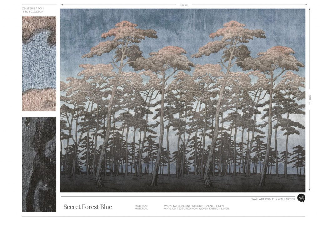 Secret Forest to wzór inspirowany sztuką, w kolekcji Nature. Tapeta przedstawia sosnowy las, o wschodzie słońca. Wzór jest bardzo neutralny i elegancki. Zgaszone kolory beżu, niebieskiego oraz brązu, nadają grafice lekkości i stonowania. Idealnie wkomponuje się w styl naturalny, skandynawski i boho, a także loftowy.