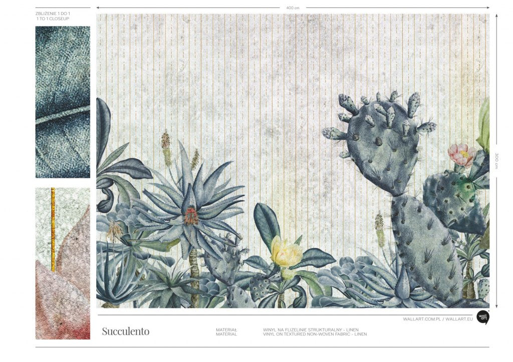 Succulento wzór w kolekcji Nature. Tapeta jest inspirowana sztuką, a kaktusy pochodzą ze starych atlasów i książek botanicznych. Sukulenty na betonowym tle połączone są z delikatnymi złotymi, pionowymi nićmi. Będzie pasował do salonu, kuchni, sypialni, łazienki czy biura.