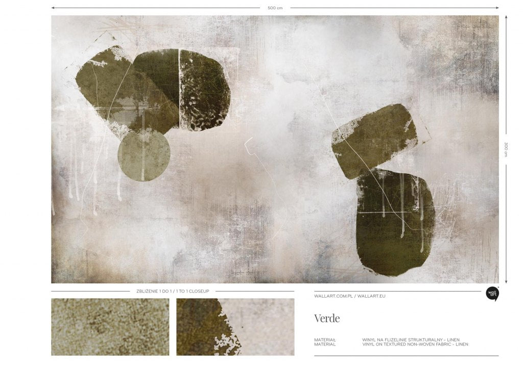 Tapeta „Verde” to propozycja dla miłośników minimalistycznej sztuki współczesnej i stonowanych wnętrz. Jej abstrakcyjny, ale wyważony charakter opiera się na organicznych formach i ziemistej kolorystyce, które razem tworzą spokojną, kontemplacyjną atmosferę. Kompozycję budują geometryzujące plamy w odcieniach zgniłej zieleni i oliwki, umieszczone na matowym, fakturalnym tle przypominającym przetartą powierzchnię płótna lub starego muru.