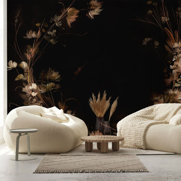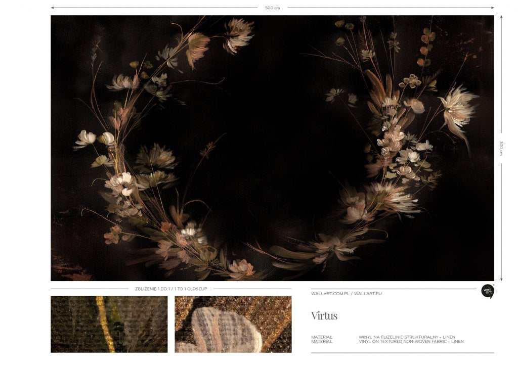 Virtus to delikatna kompozycja kwiatowa na ciemnym, niemal czarnym tle. Kwiaty są w jasnych odcieniach beżu, bieli i bladych brązów, co tworzy subtelny kontrast z tłem. Całość wygląda jak namalowana techniką akwareli, a delikatne pociągnięcia pędzla, nadają wrażenie lekkości i elegancji.