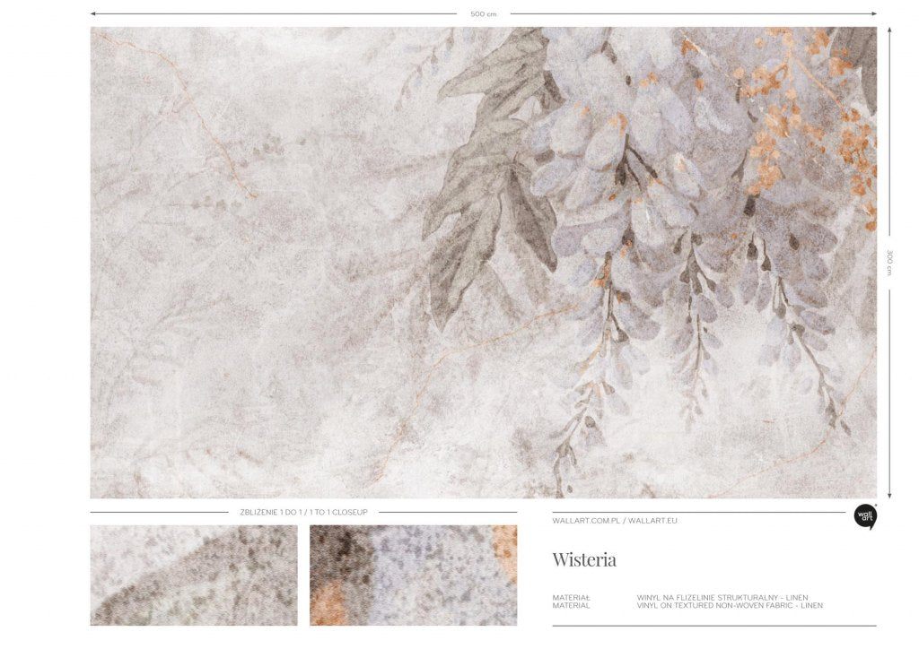 Tapeta Wisteria to delikatny motyw kwiatowy w odcieniach chłodnego beżu, naniesiony niczym tatuaż na strukturę tynku. Idealne uzupełnienie aranżacji w małych wnętrzach, pasuje do stylu loftowego, minimalistycznego , nowoczesnego skandynawskiego.