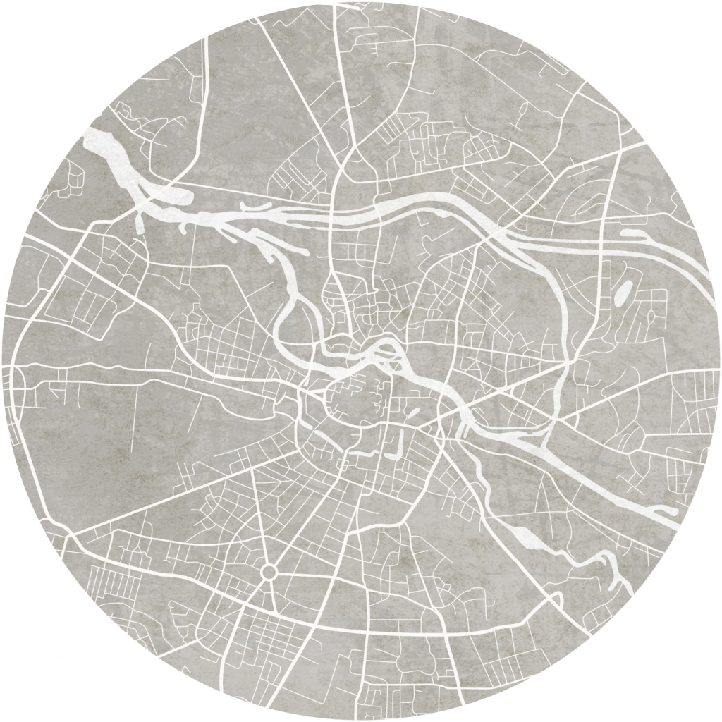 Breslau to grafika przedstawiająca plan miasta Wrocław, ukazując urbanistyczny układ miasta. Na pierwszym planie widoczna jest gęsta sieć ulic, alei i dróg, które tworzą skomplikowany wzór łączący różne części miasta. Najbardziej charakterystycznym punktem na planie jest Stare Miasto, zaznaczone wyraźnie w centrum. Breslau, dzięki zastosowaniu ograniczonej liczby kolorów jest bardzo nowoczesnym wzorem idealnym do biur, restauracji czy innych przestrzeni użyteczności publicznej.