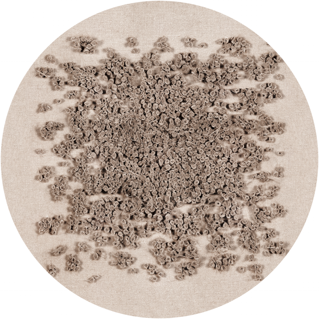 „Centro” to wzór o organicznej strukturze i geometrycznym skupieniu, który przyciąga uwagę swoją rzeźbiarską formą. Kompozycja przypomina skupisko tysięcy drobnych, zrolowanych elementów – jakby wykonanych z miękkiej tkaniny, kory lub papieru czerpanego – ułożonych w nieregularną, lecz zwartą formę w centrum pola. Kształty rozmywają się i przenikają w otaczającą je przestrzeń, tworząc wrażenie naturalnej ewolucji formy: od gęstości do ulotności. Ta gra światła i cienia sprawia, że powierzchnia wydaje się niemal trójwymiarowa. „Centro” opowiada o skupieniu i rozproszeniu, o centrum, z którego rozchodzi się pulsująca energia – interpretacja może być zarówno symboliczna, jak i czysto dekoracyjna.