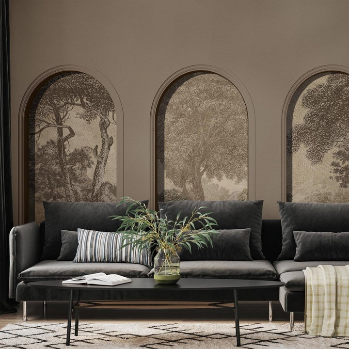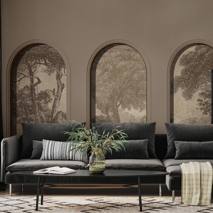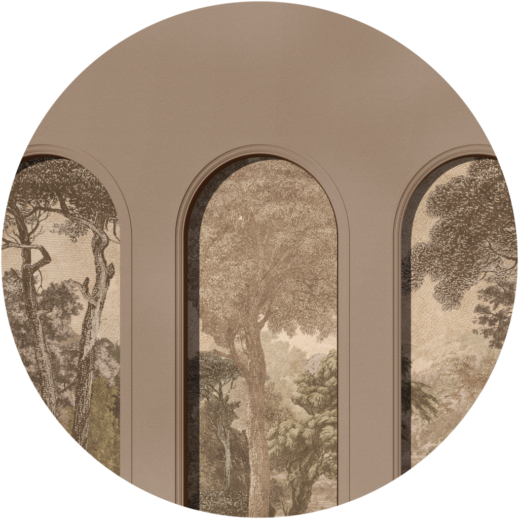 Wnętrze łuków to wzór Hood Light, który wprowadzi do wnętrza las w niezwykle eleganckim, nieco kolonialnym wydaniu. Widok nawiązujących do starych rycin przedstawia dziki, niezbrukany ludzką ręką starodrzew. Ciepłe zielenie i tło lekko stylizowane na stare ryciny, będą idealnym uzupełnieniem zarówno drewnianych mebli jak i przełamaniem nowoczesnych beży. Perspektywa uchwycona w pejzażu sprawi, że wnętrze nabierze głębi i optycznie się powiększy.