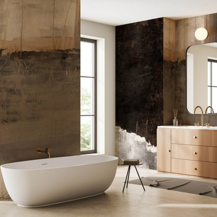„Nux” to abstrakcyjna kompozycja o wyraźnie malarskim, niemal surowym charakterze. Wzór składa się z horyzontalnych pasów i prostokątnych płaszczyzn o zróżnicowanej fakturze – od miękkich, niemal kredowych przetarć, po gęste, ciemne warstwy przypominające spatynowany metal lub ziemistą glinę. Całość przywodzi na myśl strukturalne obrazy współczesnych artystów, łączących malarstwo z materią – zacierających granice między płótnem a przestrzenią. „Nux” balansuje pomiędzy gestem a kontrolą, przypadkowością a kompozycją – tworząc tło, które nie dominuje, ale buduje głęboki, spokojny klimat wnętrza. To wzór, który nie narzuca interpretacji – raczej zostawia miejsce na refleksję i emocjonalny odbiór.