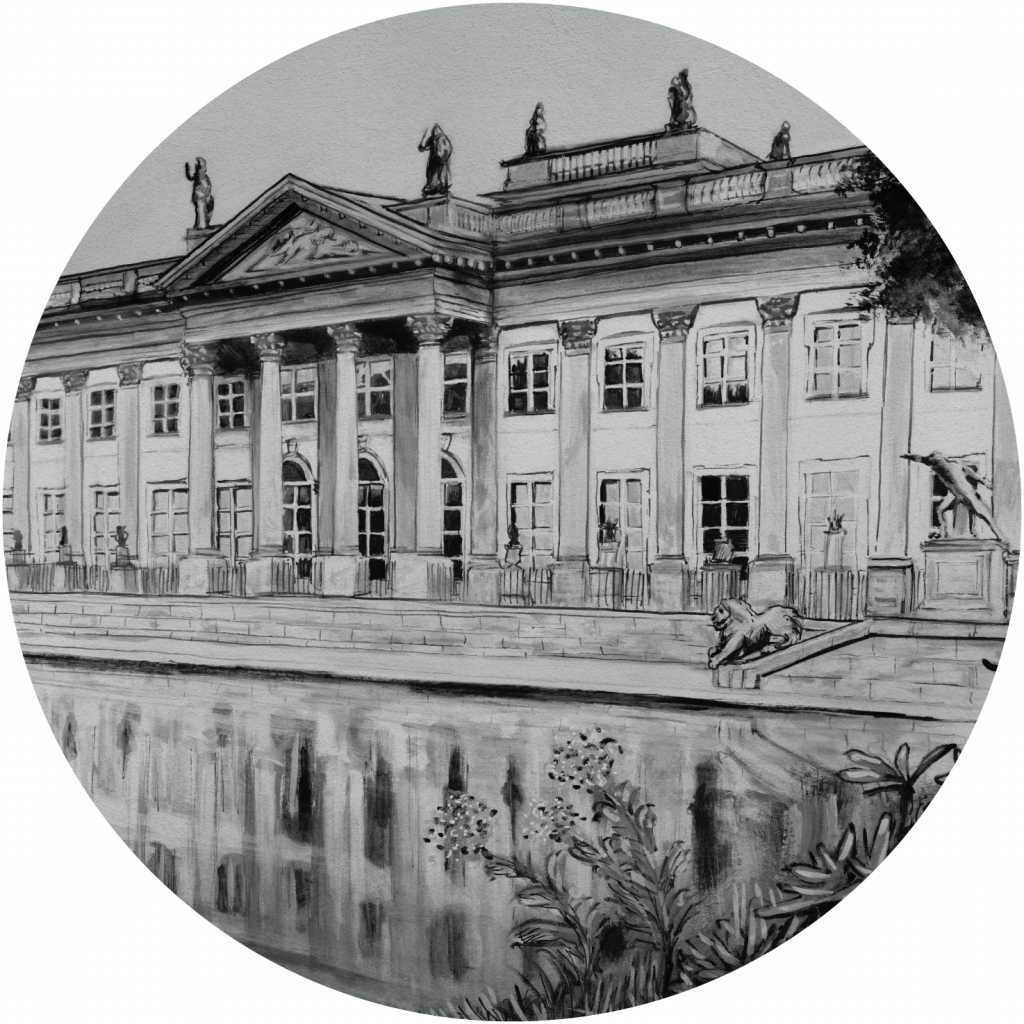 Royal to graficzna interpretacja letniej rezydencji ostatniego króla Polski – Stanisława Augusta Poniatowskiego, znajdująca się w warszawskich Łazienkach. Elegancki pałac z kolumnadą, usytuowany nad wodą, której spokojna powierzchnia odbija architekturę budynku to codzienny krajobraz. Otoczony jest przez bujną roślinność, co nadaje całości malowniczego uroku. Royal wniesie do przestrzeni poczucie klasycznej elegancji i majestatyczności. Idealnie nadaje się do salonu urządzonego w stylu klasycznym lub eklektycznym, gdzie będzie centralnym punktem dekoracyjnym, przyciągającym wzrok i dodającym głębi wnętrzu. Jego monochromatyczna kolorystyka sprawia, że doskonale komponuje się z różnymi paletami barw, wprowadzając jednocześnie subtelny, lecz wyrafinowany akcent. Dzięki swojej kompozycji, Royal może również doskonale sprawdzić się w przestrzeniach publicznych, takich jak hotele czy restauracje, gdzie podkreśli prestiż miejsca i zapewni odwiedzającym estetyczne doznania.