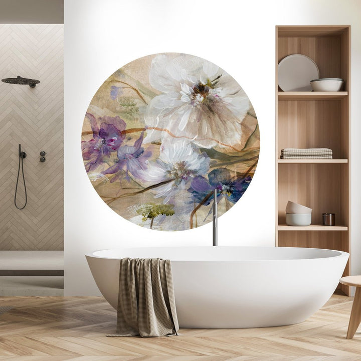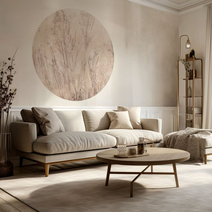 Nasze koła mają średnicę 130 cm i są drukowane na samoprzylepnym winylu o subtelnej strukturze płótna. To materiał, który prezentuje się lekko i elegancko, a jednocześnie jest zmywalny i trwały. Dzięki temu możesz je bez obaw stosować nie tylko na ścianie, ale również na meblach, drzwiach czy szkle – wszędzie tam, gdzie chcesz dodać wnętrzu charakteru.