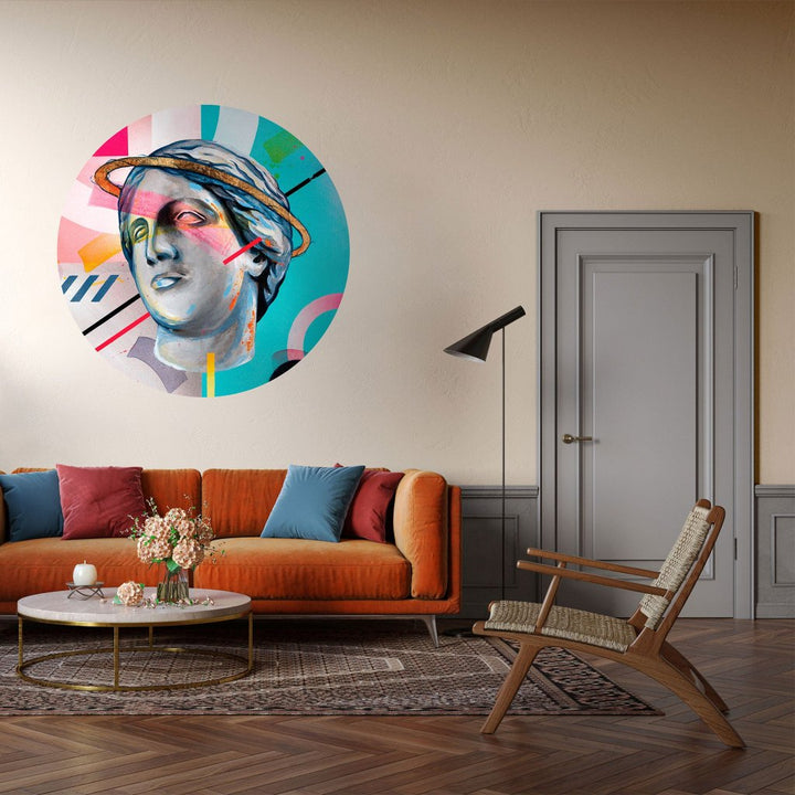 Nasze koła mają średnicę 130 cm i są drukowane na samoprzylepnym winylu o subtelnej strukturze płótna. To materiał, który prezentuje się lekko i elegancko, a jednocześnie jest zmywalny i trwały. Dzięki temu możesz je bez obaw stosować nie tylko na ścianie, ale również na meblach, drzwiach czy szkle – wszędzie tam, gdzie chcesz dodać wnętrzu charakteru.