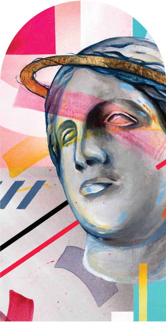 Aires to dynamiczna, soczysta kompozycja, w której centralnym punktem jest klasyczna marmurowa rzeźba głowy. Popiersie, przedstawiające klasyczne rysy twarzy, jest realistycznie odwzorowane, ale jednocześnie zintegrowane z abstrakcyjnym, kolorowym tłem. Trudno oderwać wzrok od tła Aires, pełnego różnorodnych tekstur i technik malarskich. Widać tu delikatne rozpryski farby, subtelne gradienty kolorów oraz intensywne, grube pociągnięcia pędzla, które tworzą bogatą, wielowarstwową powierzchnię. Aires to mariaż elementów klasycznej sztuki z nowoczesnym z abstrakcyjnym podejściem. Wzór jest pełen energii i życia, dzięki czemu przyciąga wzrok i skłania do dłuższego zatrzymania się nad jego detalami. Jego intensywna kolorystyka i dynamiczna forma sprawiają, że jest idealny do nowoczesnych wnętrz, gdzie może stanowić centralny punkt dekoracyjny, dodając przestrzeni artystycznego wyrazu i charakteru.