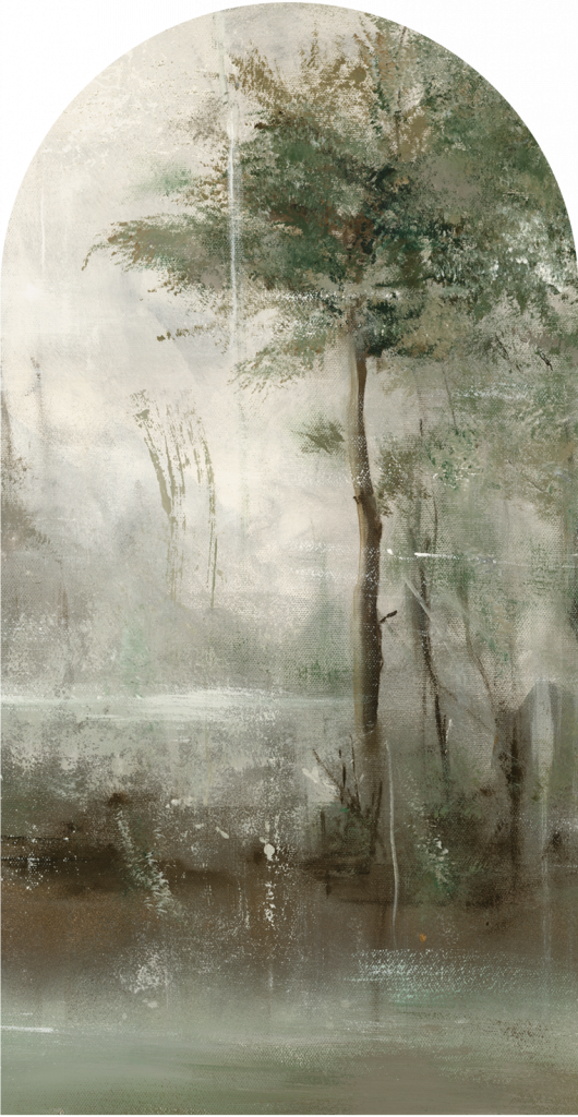 Tapeta „Lacus” to malarska opowieść o spokoju, ciszy i subtelnej potędze natury. Inspirowana krajobrazem odbitym w tafli jeziora, wzór przedstawia mglisty pejzaż leśny, zanurzony w kojącej atmosferze poranka. Delikatnie rozmyte kontury drzew i subtelne przejścia tonalne sprawiają wrażenie, jakby obraz był uchwycony przez zasłonę z pary wodnej – co nadaje tapecie poetycki, niemal oniryczny charakter.