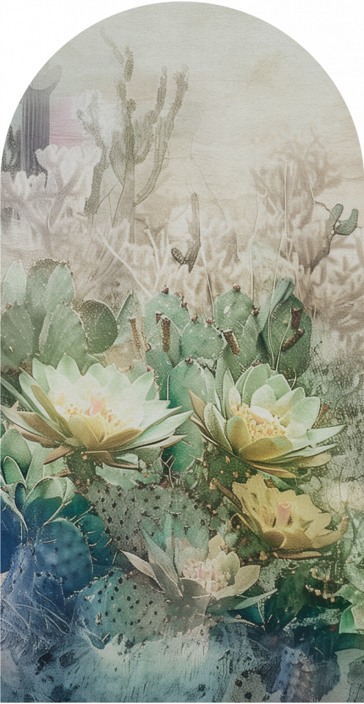 „Pamo” to subtelna podróż przez krajobraz pustyni, w której życie rozkwita mimo surowych warunków. Ilustracja przedstawia kompozycję pełną kaktusów, agaw i kwitnących opuncji, otulonych akwarelową mgłą i pastelowym światłem. Wzór zaskakuje lekkością i harmonią – to obraz natury, który koi zmysły i dodaje przestrzeniom organicznej głębi.