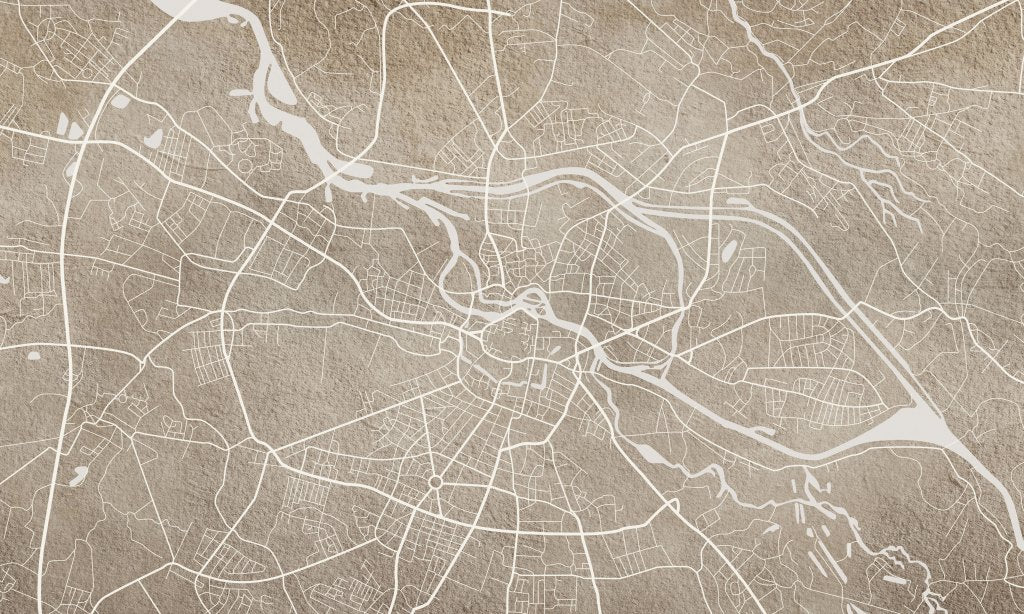 Breslau to grafika przedstawiająca plan miasta Wrocław, ukazując urbanistyczny układ miasta. Na pierwszym planie widoczna jest gęsta sieć ulic, alei i dróg, które tworzą skomplikowany wzór łączący różne części miasta. Najbardziej charakterystycznym punktem na planie jest Stare Miasto, zaznaczone wyraźnie w centrum. Breslau, dzięki zastosowaniu ograniczonej liczby kolorów jest bardzo nowoczesnym wzorem idealnym do biur, restauracji czy innych przestrzeni użyteczności publicznej.