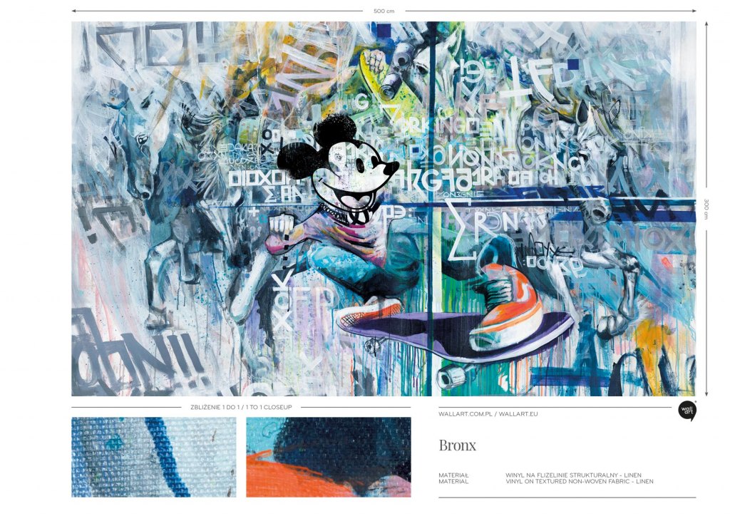 Bronx jest dynamiczną mieszanką różnych elementów, które tworzą złożoną i pełną energii kompozycję. W centrum uwagi znajduje się postać Myszki Miki wykonującą trik na deskorolce, co nadaje całości miejskiego, nowoczesnego charakteru. Bronx wykonany w duchu kultury miejskiej i street artu, jest jednocześnie surowy i ekspresyjny, z wyraźnymi pociągnięciami pędzla i rozpryskami farby, co dodaje kompozycji dodatkowej warstwy teksturalnej. Bronx sprawdzi się szczególnie w przestrzeniach urządzonych w stylu industrialnym, eklektycznym lub nowoczesnym.