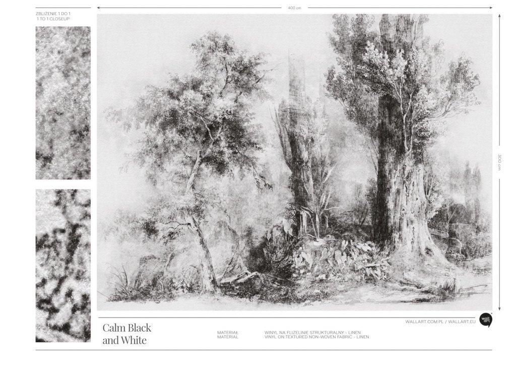 Calm Black and White to wzór inspirowany sztuką, w kolekcji Nature, powstały na bazie obrazu z XVIIIw. Czarno biały szkic przedstawiający drzewa, może być delikatną ozdobą każdego wnętrza. Tapeta nawiązuje do natury, wzór uspokaja, a jednocześnie jest bardzo oryginalny. Będzie pasował do salonu, kuchni, sypialni, łazienki czy biura.