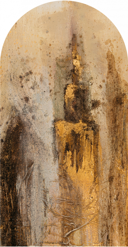 Tapeta „Capital” to pełna ekspresji kompozycja inspirowana wielkomiejską energią, monumentalną architekturą i siłą pionowych struktur. Przypomina artystyczną interpretację panoramy metropolii – wieżowce zbudowane z faktur, kolorów i śladów pędzla zdają się wyrastać z głębokiego tła niczym miasto budowane z emocji. Wzór, mimo dynamicznego charakteru, zachowuje elegancję i wyrafinowanie – dzięki ręcznemu wykonaniu i wyczuwalnej głębi materiału.