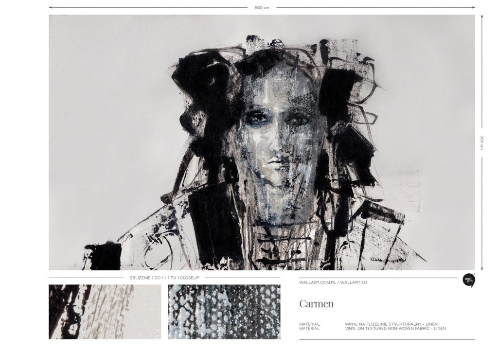 Carmen to enigmatyczny portret kobiety, wykonany w stylu abstrakcyjno-ekspresjonistycznym. Centralnym punktem wzoru jest częściowo realistyczna twarz kobiety, która choć wyrazista, jest również rozmyta, a przeplatające się na niej różne odcienie szarości, bieli i czerni, nadają jej tajemniczy i nieco niepokojący charakter. Oczy kobiety są głęboko osadzone i patrzą prosto na widza, co dodaje kompozycji intensywności i emocjonalnego ładunku. Kolorystyka wzoru jest minimalistyczna, oparta na kontrastach między czernią, bielą i szarościami, co podkreśla dramatyczny i introspektywny charakter portretu. Całość tworzy wrażenie melancholii i tajemnicy, zachęcając do refleksji nad emocjami i historią przedstawionej postaci. Ekspresyjny styl Carmen i intensywna kolorystyka sprawiają, że jest idealny do przestrzeni, które potrzebują wyrazistego, artystycznego akcentu. To dzieło sztuki, które przyciąga wzrok i skłania do dłuższego zatrzymania się, aby docenić jego bogactwo detali i emocjonalną głębię.
