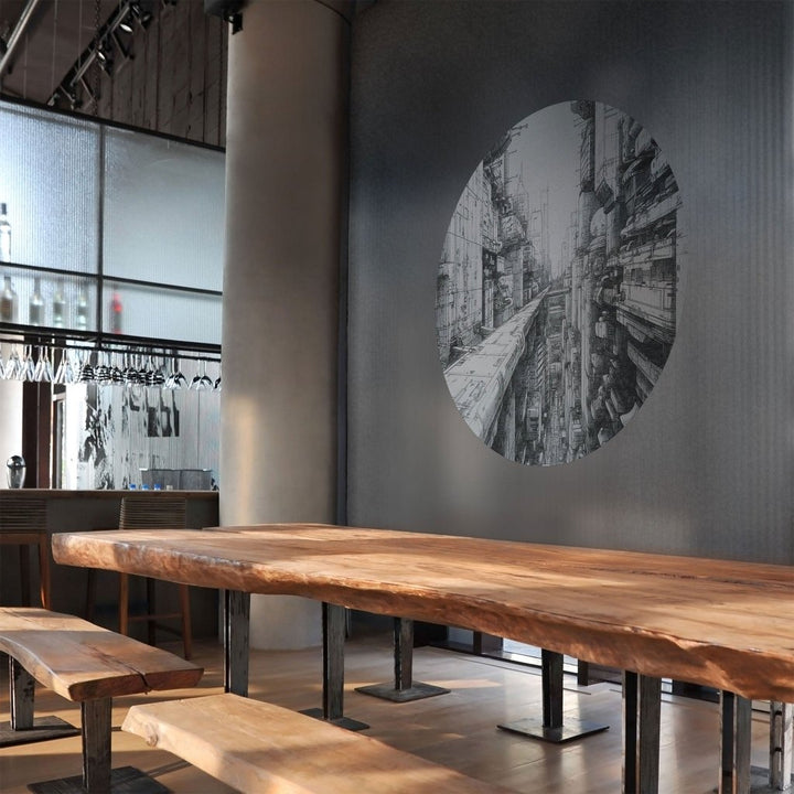 Cyber City to wizja futurystycznego miasta o skomplikowanej, wielopoziomowej architekturze. Wzór ukazuje ciasno zabudowane, monumentalne budynki z licznymi elementami technologicznymi, kablami i rurami, tworzącymi skomplikowaną sieć. Detaliczny charakter Cyber City i jego monochromatyczna kolorystyka nadają mu industrialny, cyberpunkowy klimat. Tego typu wzór idealnie sprawdzi się w nowoczesnych wnętrzach, szczególnie w przestrzeniach biurowych, salonach czy loftach, gdzie dominują surowe, minimalistyczne elementy. Może stanowić główny punkt dekoracyjny, wprowadzając dynamiczny, futurystyczny akcent i podkreślając zamiłowanie właściciela do nowoczesnych technologii oraz awangardowego designu. Cyber City umieszczony na ścianie, doda wnętrzu głębi i wyrazistego charakteru, a jego szczegółowość z pewnością przyciągnie uwagę i stanie się tematem rozmów.