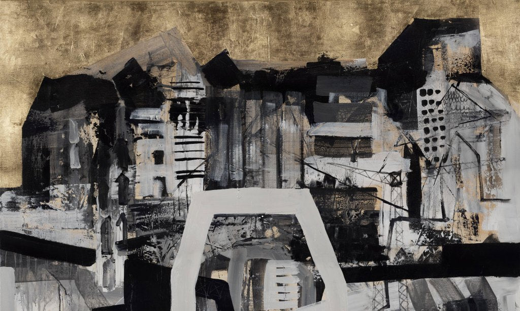 Eldorado to abstrakcyjna interpretacja miejskiego krajobrazu, z wyraźnymi, geometrycznymi formami i dominującą, surową kolorystyką. Tło wzoru utrzymane jest w złotych odcieniach, co nadaje kompozycji elegancji i kontrastuje z ciemniejszymi, bardziej stonowanymi kolorami dominującymi w dolnej części. Główna część Eldorado przedstawia złożoną, wielowarstwową strukturę, przypominającą budynki i konstrukcje miejskie. Kolorystyka tej części jest zdominowana przez odcienie czerni, bieli i szarości, z subtelnymi akcentami beżu. Eldorado ma silny, industrialny charakter, co sprawia, że doskonale pasuje do nowoczesnych, loftowych wnętrz. Jego surowość i geometryczność mogą stanowić ciekawy kontrast dla bardziej minimalistycznych aranżacji, dodając im głębi i wyrazistości. Dzięki złotemu tłu, obraz zyskuje również elegancji, co może być interesującym akcentem w bardziej klasycznych wnętrzach.