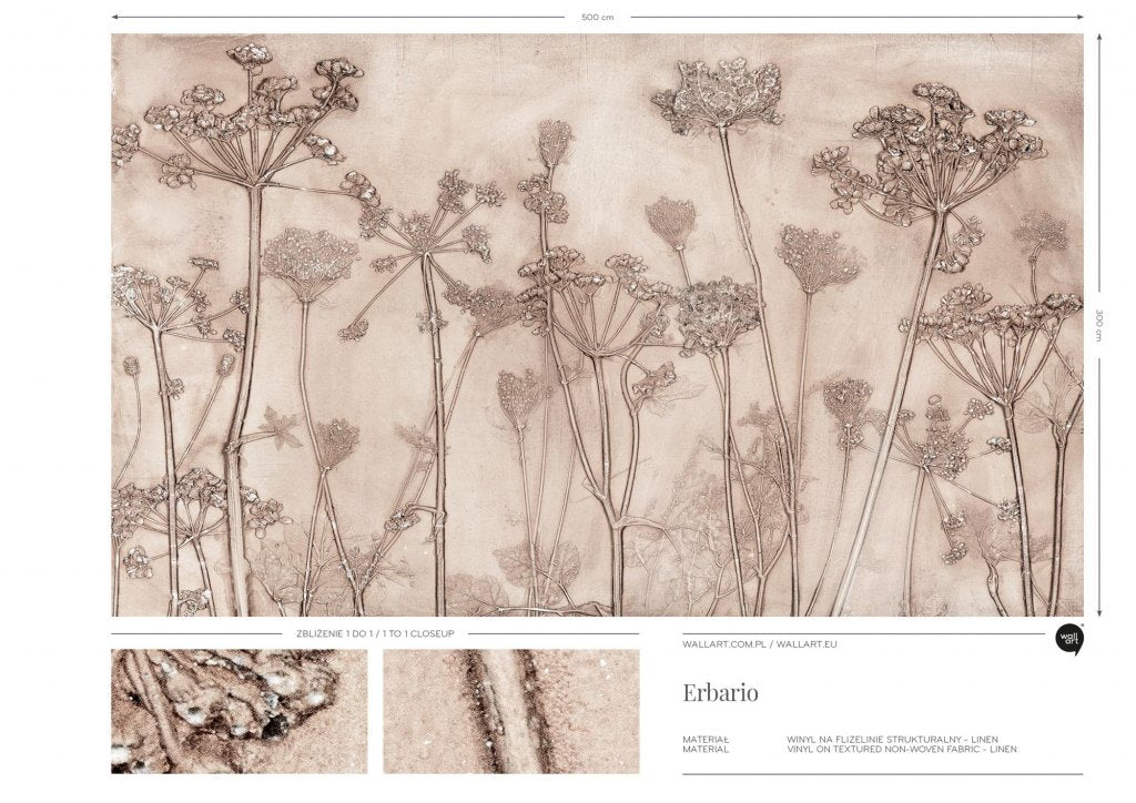 Tapeta „Erbario” to wyjątkowa propozycja dla miłośników subtelnych, naturalnych motywów w nowoczesnej odsłonie. Wzór inspirowany jest suszonymi roślinami oraz tradycją zielników – delikatne łodygi i baldachy kwiatów tworzą organiczną kompozycję, która zachwyca przestrzennością i artystyczną precyzją. Trójwymiarowy efekt płaskorzeźby na matowym tle nadaje tapecie wyjątkowego charakteru, budując harmonijną atmosferę w każdym wnętrzu.