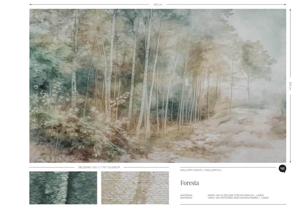 Tapeta „Foresta” to nastrojowa podróż do wnętrza zaczarowanego lasu, gdzie światło przenika przez smukłe pnie drzew i otula ścieżkę miękką mgłą. Kompozycja przypomina ręcznie malowany pejzaż akwarelowy – subtelny, lekko rozmyty, z delikatnie zaznaczonym konturem drzew i roślinności.