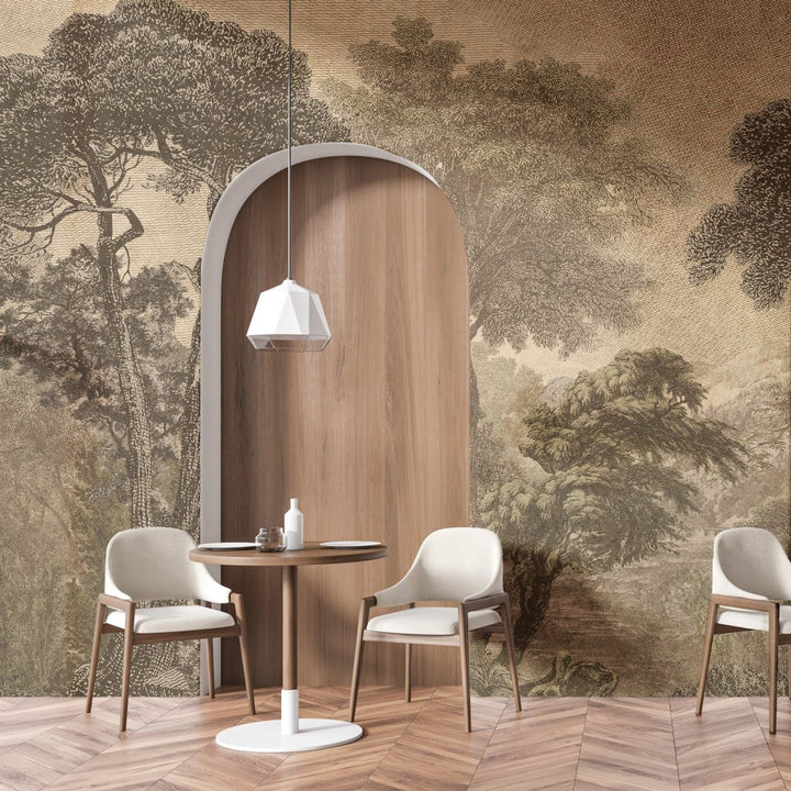 Otoczeni przez rozrastającą się miejską dżunglę, poszukujemy azylu we własnych domach, tworząc przestrzenie zbliżające nas do przyrody. Hood wprowadzi do wnętrza las w niezwykle eleganckim, nieco kolonialnym wydaniu. Widok nawiązujących do starych rycin przedstawia dziki, niezbrukany ludzką ręką starodrzew. Ciepłe zielenie i tło lekko stylizowane na stare ryciny, będą idealnym uzupełnieniem zarówno drewnianych mebli jak i przełamaniem nowoczesnych beży. Perspektywa uchwycona w pejzażu sprawi, że wnętrze nabierze głębi i optycznie się powiększy.