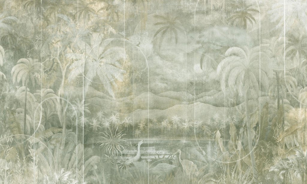 Juca przedstawia subtelną i stonowaną scenę tropikalnego krajobrazu, pełną delikatnych odcieni zieleni, beżu i szarości. Dominują motywy roślinne, z wieloma palmami i bujną roślinnością, tworzą gęstą i bogatą teksturę całej kompozycji. Juca emanuje spokojem i naturalnym pięknem, przedstawiając tropikalny krajobraz w sposób, który jest zarówno realistyczny, jak i marzycielski. Delikatne odcienie i szczegółowe przedstawienie roślinności tworzą harmonijną i estetycznie przyjemną scenę idealną do salonu czy sypialni.