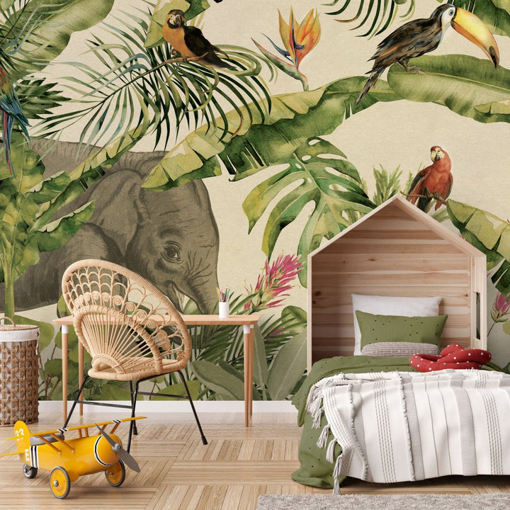 Jungle to wzór w kolekcji nature, nawiązujący do nurtów afrykańskich i egzotycznych. Palmy, monastery, liście bananowca oraz przepiękne papugi namalowane przez osiemnastowiecznych malarzy, na kremowym tle o strukturze płótna- będą niebanalną ozdobą wnętrza.