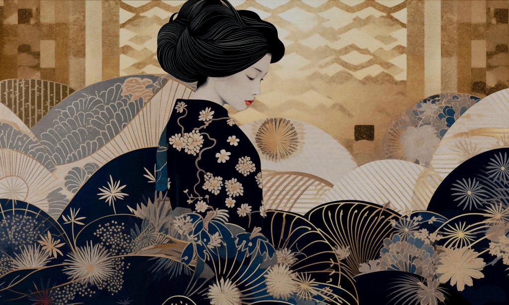 Kinui przedstawia stylizowaną postać kobiety w tradycyjnym japońskim kimono, umiejscowioną na tle bogato zdobionych motywów florystycznych i geometrycznych. Kolorystyka wzoru jest zdominowana przez ciepłe odcienie złota, beżu oraz głębokie tony granatu i czerni, co nadaje mu elegancji i wyrafinowania. Kinui doskonale wkomponuje się w przestrzenie inspirowane stylem orientalnym, gdzie liczy się harmonia, symetria oraz bogactwo detali. Wzór może stanowić centralny punkt w salonie, nadając mu artystyczny charakter i wprowadzając element etniczny. Świetnie sprawdzi się również w sypialni, tworząc atmosferę spokoju i wyciszenia dzięki stonowanej kolorystyce i delikatnemu przedstawieniu postaci. Dzięki swojej złożoności i szczegółowości, może być użyty jako dekoracja w minimalistycznych wnętrzach, gdzie będzie stanowił wyrazisty akcent. Pasuje również do przestrzeni urządzonych w stylu japandi, który łączy skandynawski minimalizm z japońską estetyką. Materiały takie jak drewno, jedwab czy bambus będą doskonałym uzupełnieniem dla takiej dekoracji, podkreślając jej egzotyczny i elegancki charakter.