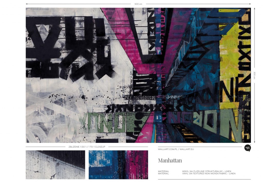Manhattan przedstawia trójwymiarową kompozycję inspirowaną stylem street art. Jego dominującymi kolorami są odcienie czerni, bieli, fioletu, niebieskiego oraz żółci. Czarne, wyraziste litery i symbole są rozmieszczone w sposób asymetryczny, tworząc wrażenie ruchu i głębii. Jego intensywna kolorystyka i surowy charakter doskonale współgrają z betonowymi ścianami, surowymi materiałami oraz minimalistycznym umeblowaniem. Obraz ten może być centralnym punktem w salonie, biurze czy loftowym apartamencie, przyciągając wzrok i dodając wnętrzu odrobinę miejskiego charakteru oraz artystycznej ekspresji.