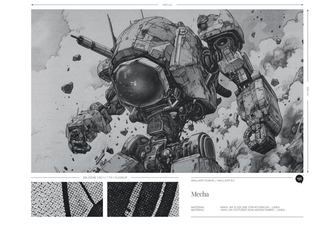 Mecha przedstawia imponującego robota w dynamicznej pozie, otoczonego eksplozjami i unoszącymi się odłamkami. Szczegółowo wykonana grafika, utrzymana w tonacji szarości, emanuje futurystycznym i industrialnym klimatem, co sprawia, że jest idealnym elementem dekoracyjnym nie tylko do pokoju nastolatka, ale także do "dorosłych", nowoczesnych wnętrz, gdzie surowe materiały, takie jak beton, stal i szkło, są dominujące. W pokojach młodzieżowych, szczególnie tych urządzonych w stylu science-fiction lub futurystycznym, wzór ten będzie idealnym uzupełnieniem. Mecha może również stanowić ciekawy kontrast w minimalistycznych wnętrzach, wprowadzając element zaskoczenia i dynamiki.