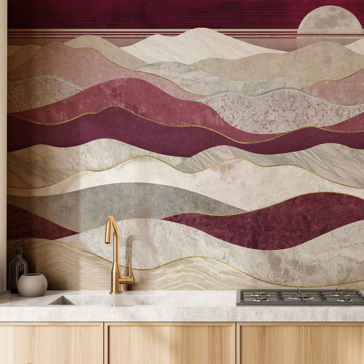 Merlot to abstrakcyjna kompozycję falistych linii i pasów w odcieniach burgundu, szarości, beżu oraz bieli, z delikatnymi złotymi akcentami, przywodząca na myśl krajobraz górski, z miękkimi liniami wzgórz i dolin. Każda z warstw ma unikalną teksturę, od szorstkich, kamiennych powierzchni po gładkie, marmurowe wykończenia, co sprawia, że Merlot ma jednocześnie harmonijny i dynamiczny charakter. Znakomicie sprawdzi się w nowoczesnym salonie, sypialni czy gabinecie. Ciepłe, ziemiste kolory i złote detale wprowadzą do wnętrza poczucie luksusu i wyrafinowania, idealnie komponując się z minimalistycznymi meblami i dodatkami w neutralnych barwach, takich jak biel, szarość i beż, podkreślając jednocześnie elegancję i styl pomieszczeniu.